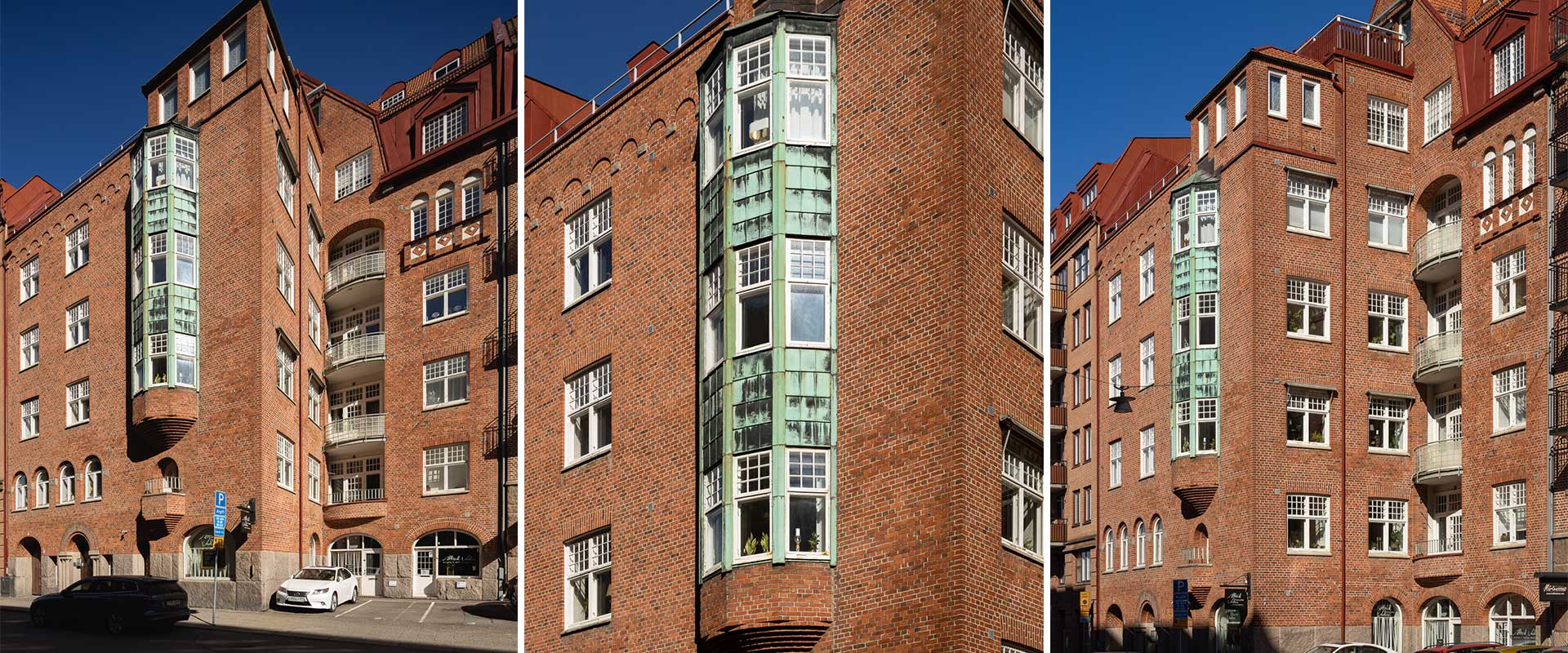 Hedåsgatan 4 ligger centralt i Göteborg och är byggt i en arkitektur tidstypisk för 1910-talet. Arkitekt Hans Jyllin använde det för tiden nya uttrycket med zinkvita fönster med många detaljer för att få en fasad med stor rikedom i variation och uttryck. På uppdrag åt förvaltare och bostadsrättsförening har vi tagit fram bygglovsritningar för nya fönster i originalutseende som möter alla de krav som ställs på handlingar för en byggnad inom bevarandeprogram för kulturhistoriskt värdefull bebyggelse i Göteborg.