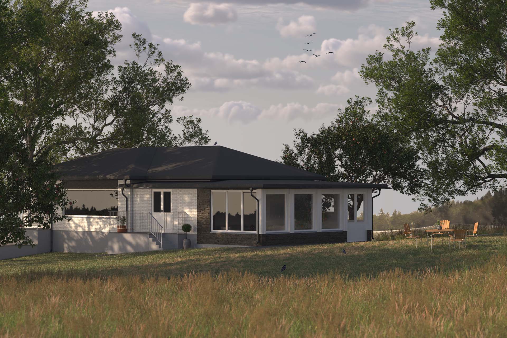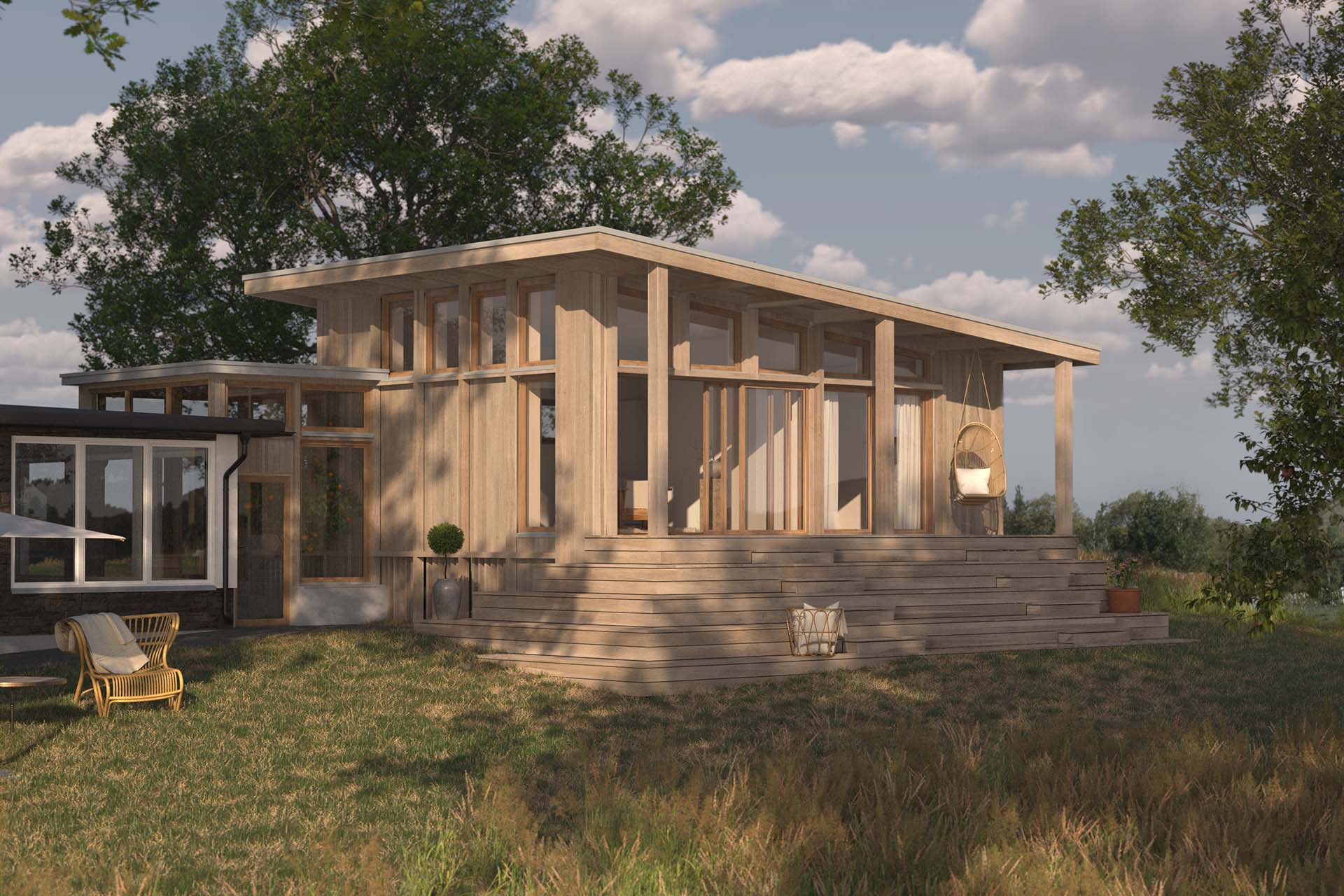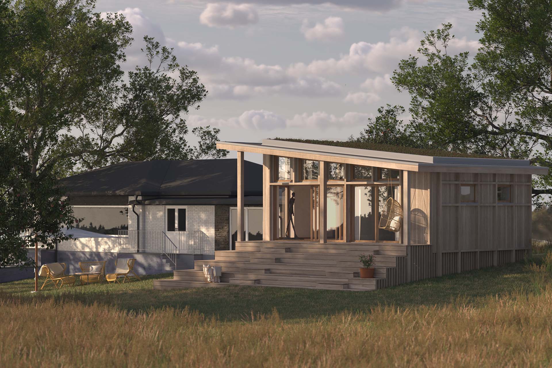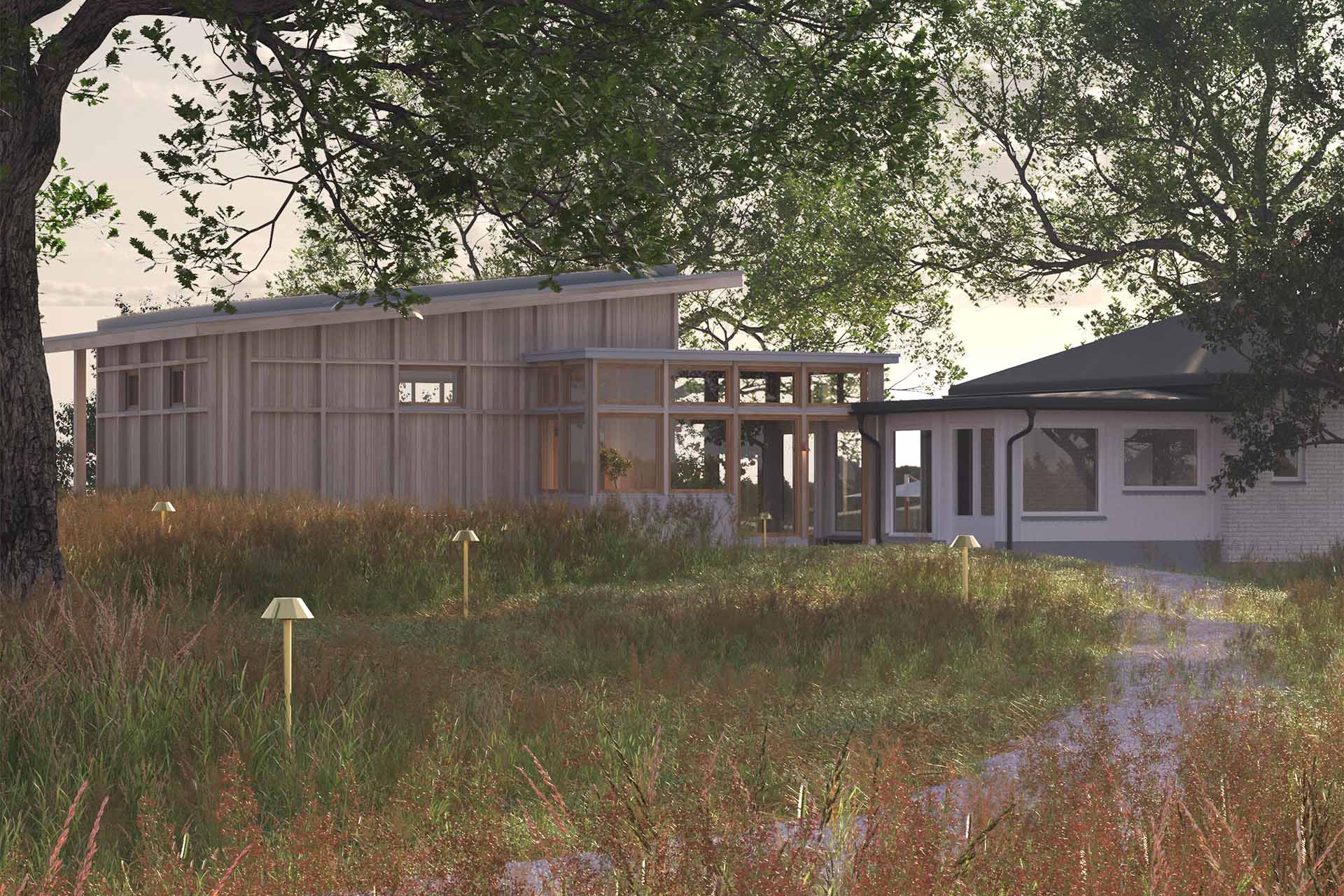 Beställare hade önskemål om mer yta för att kunna samla familj och vänner under samma tak, samtidigt som den privata bostadsdelen skulle hållas separerad ifrån gästernas del av hemmet. Resultatet blev en tillbyggnad som formmässigt står för sig själv och samtidigt utgör ett modernt inslag som bidrar till en internationell atmosfär på tomten. Tillbyggnaden förenklar för familjen att på ett enkelt sätt kunna umgås, samtidigt som gäster kan rå om sig själva i sin del av bostaden.