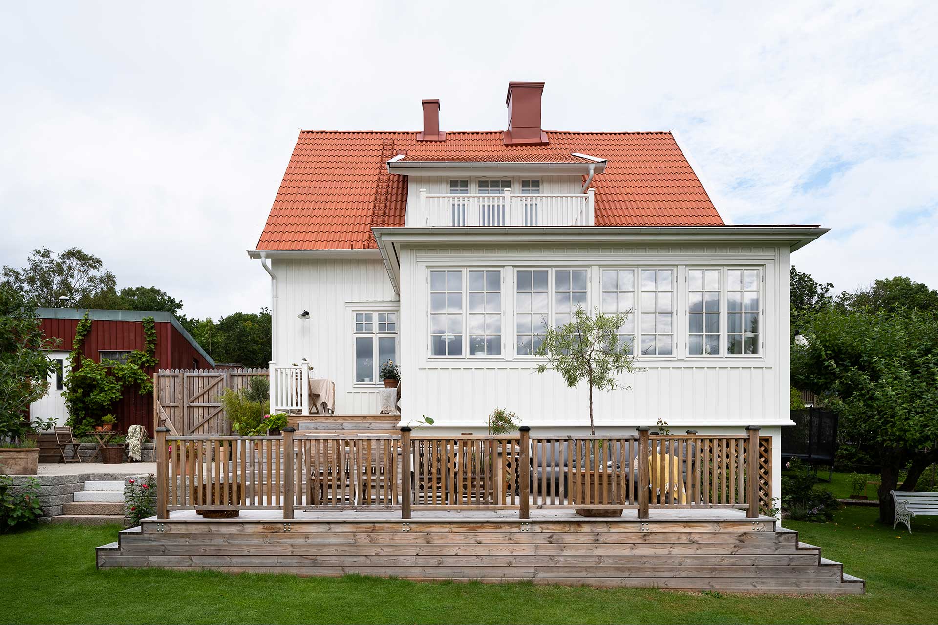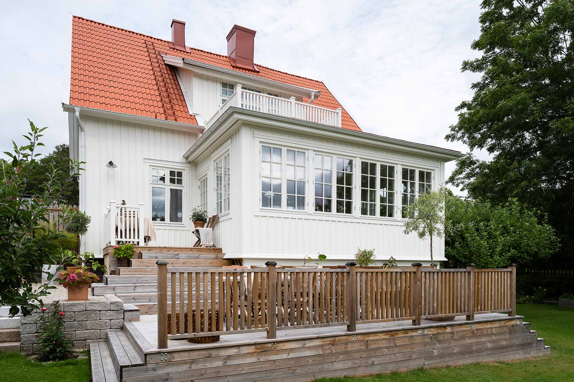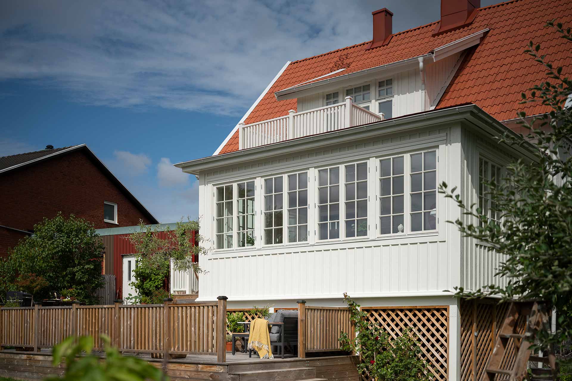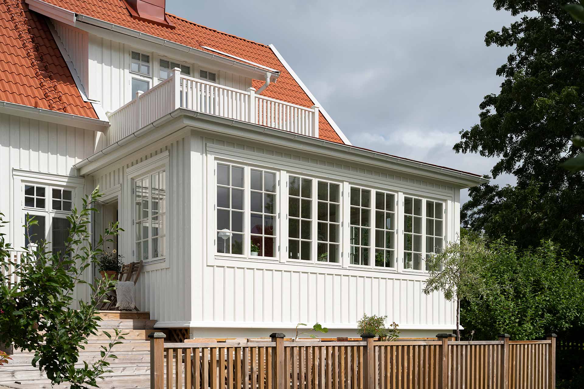 Denna större trävilla från 1914 har fått renoverad fasad och byte av fönster till mer ursprunglig stil. Tillbyggnad av glasad veranda med ovanpåliggande balkong. Ny altan som närmar sig gräsmattan i flera olika nivåer ökar kontakten med trädgården. Husets fasad har målats om från röd till vit.