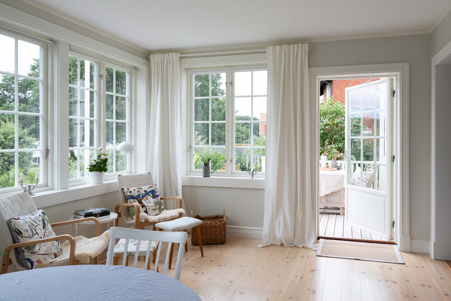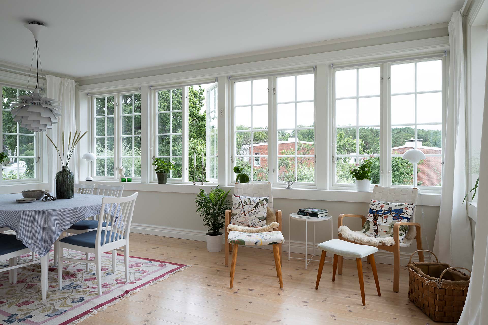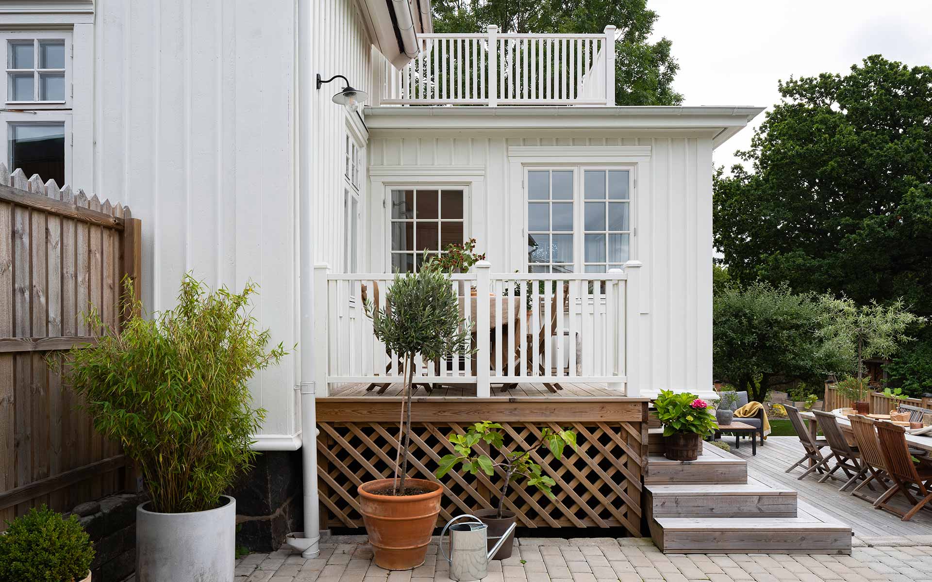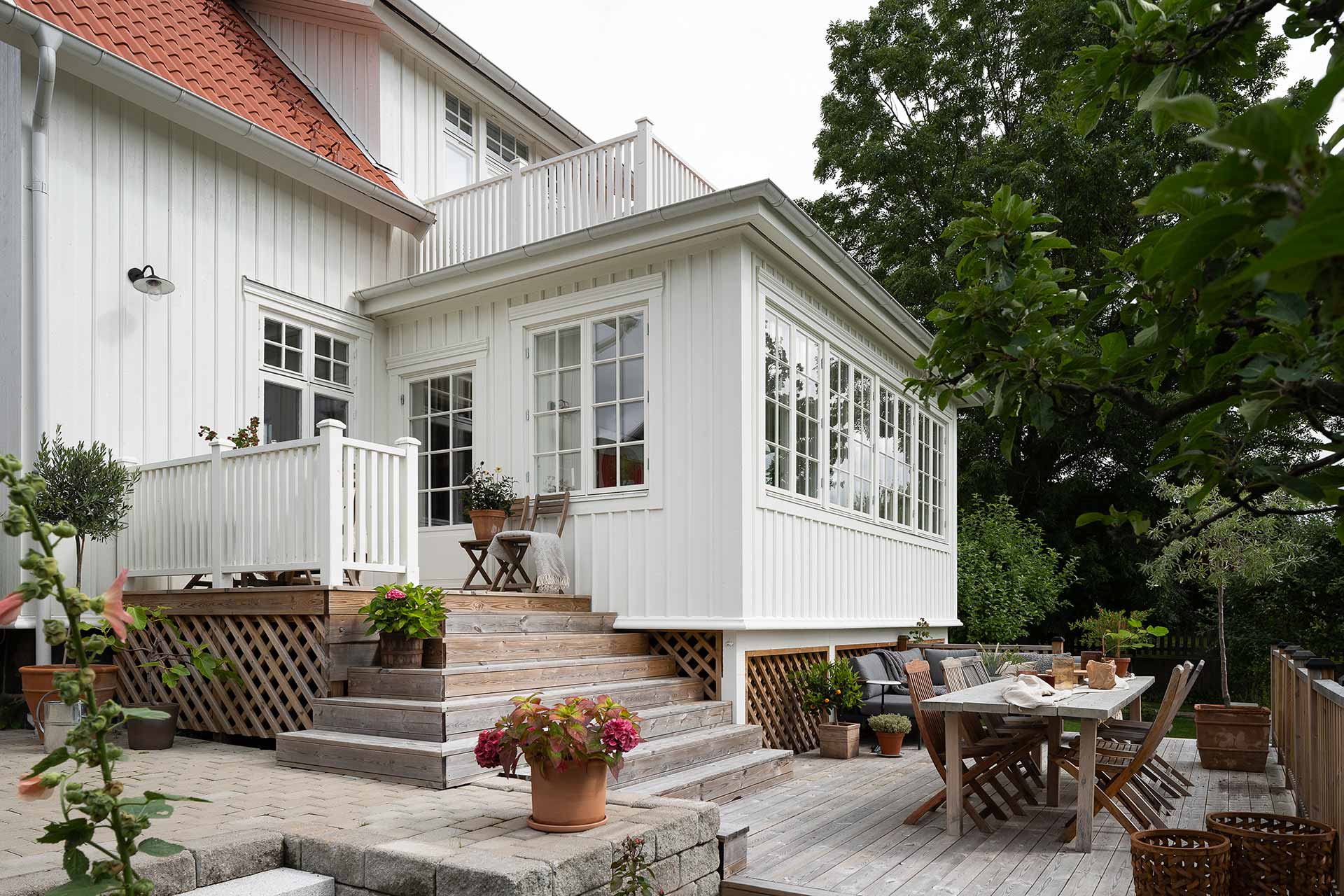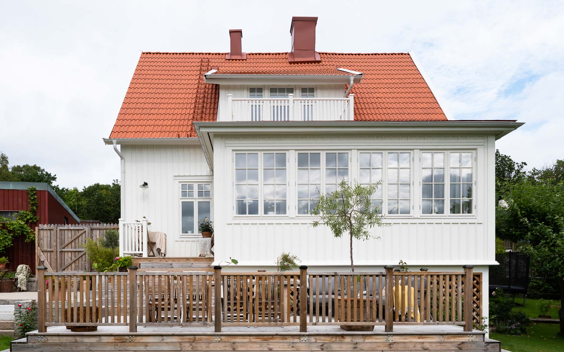 Denna större trävilla från 1914 har fått renoverad fasad och byte av fönster till mer ursprunglig stil. Tillbyggnad av glasad veranda med ovanpåliggande balkong. Ny altan som närmar sig gräsmattan i flera olika nivåer ökar kontakten med trädgården. Husets fasad har målats om från röd till vit.