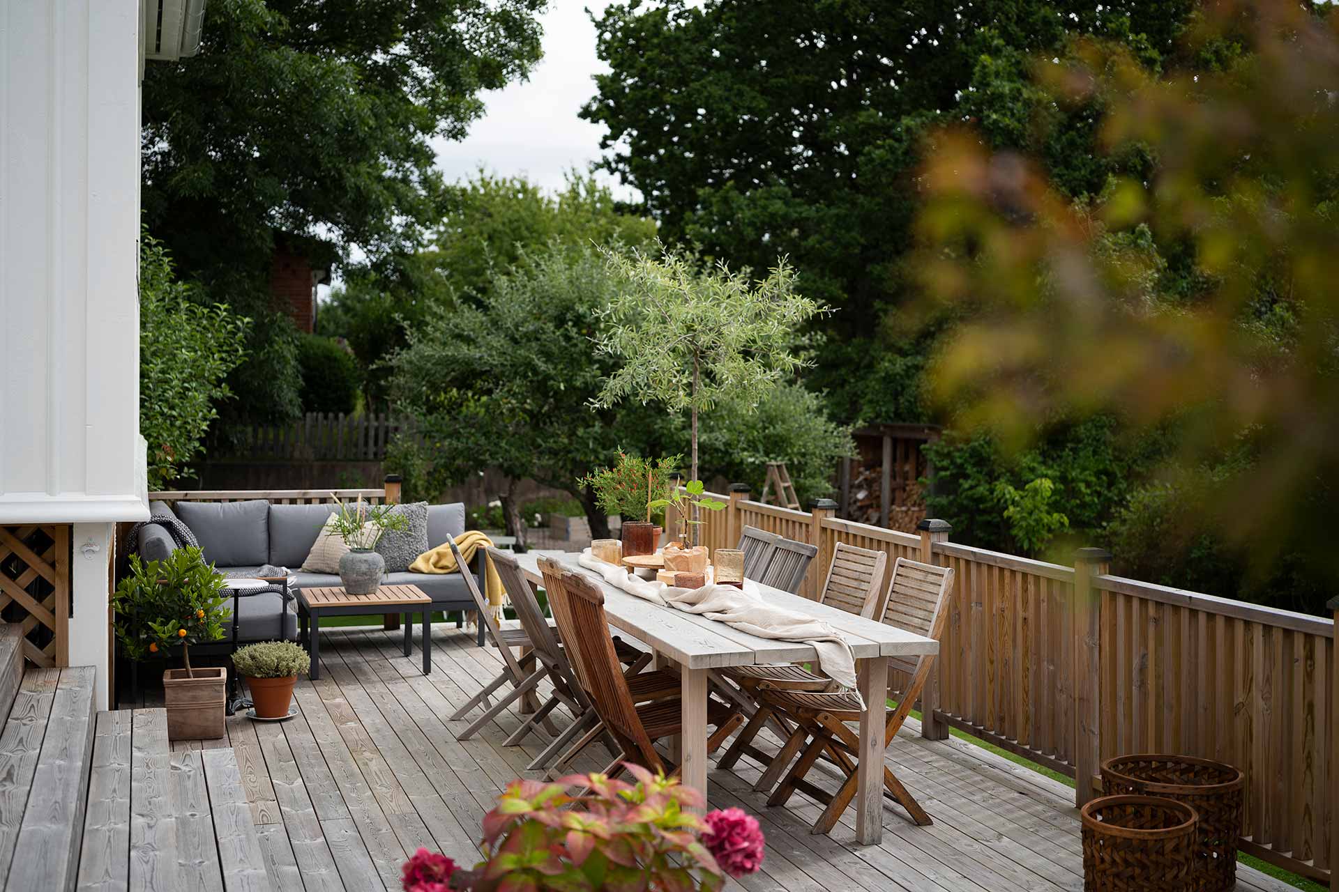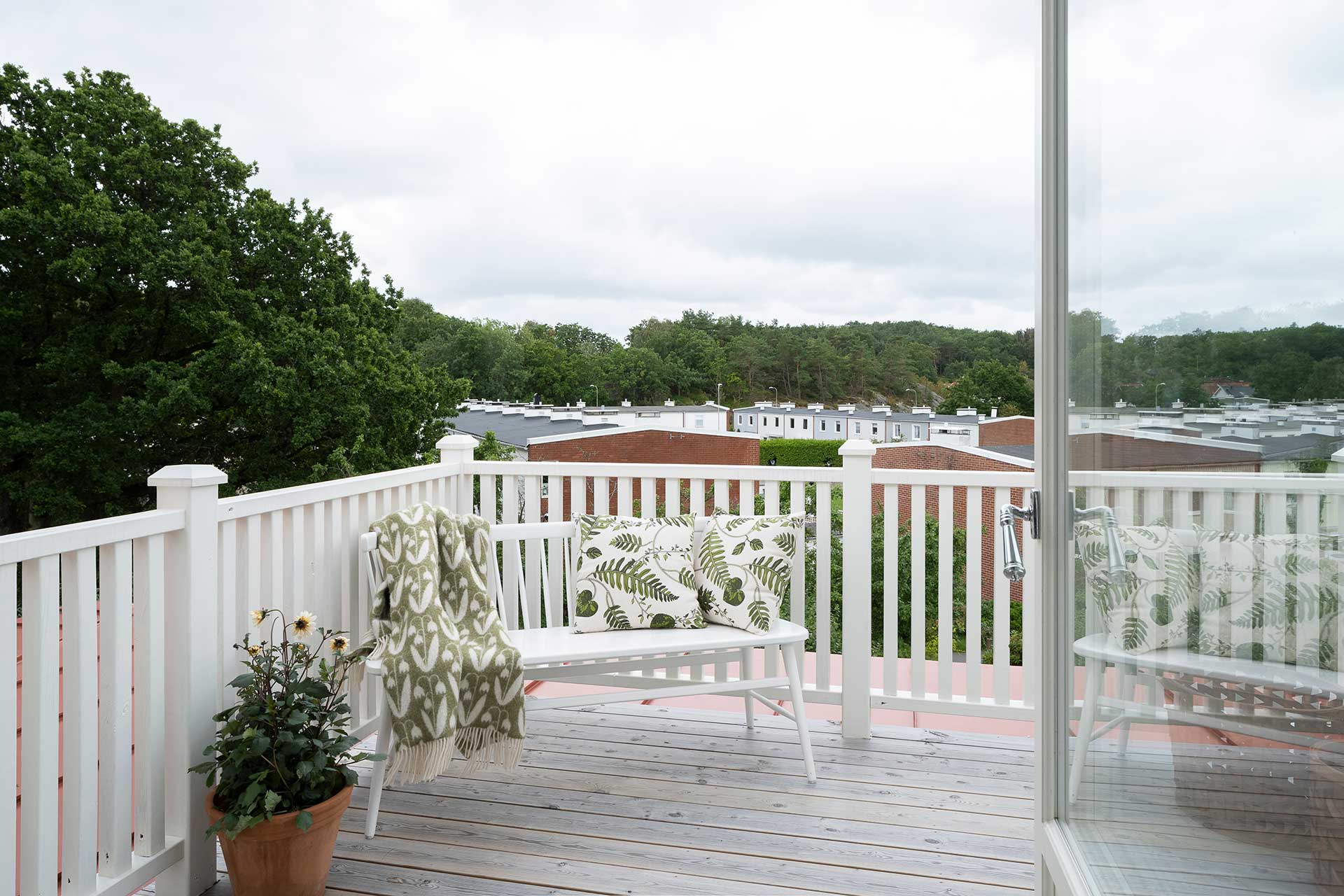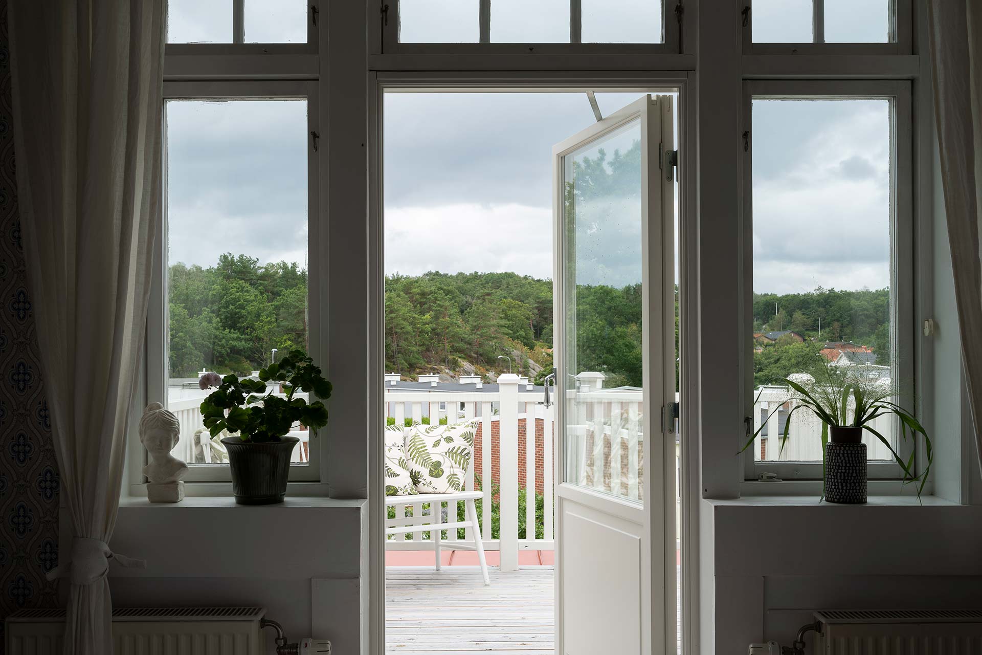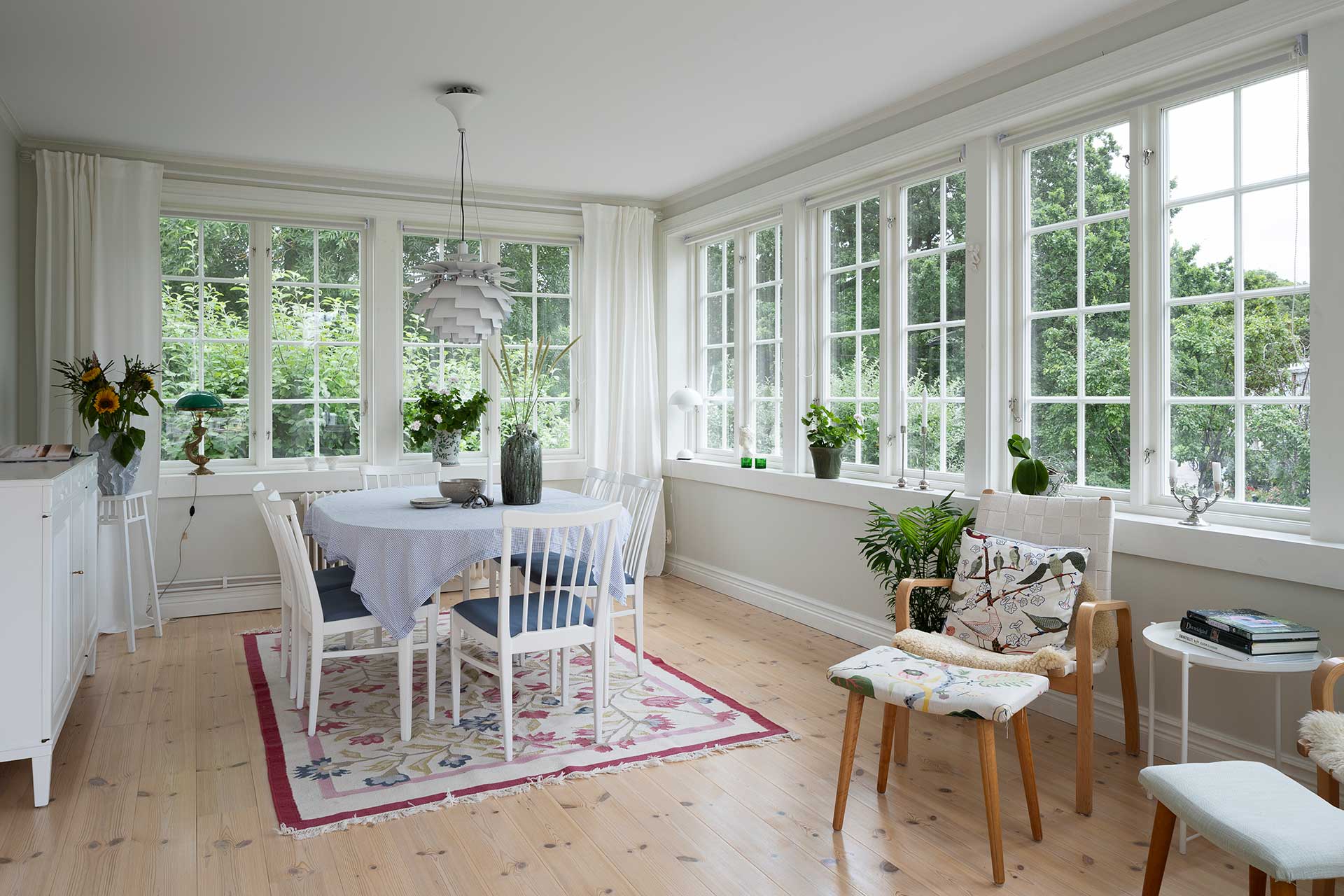 Denna större trävilla från 1914 har fått renoverad fasad och byte av fönster till mer ursprunglig stil. Tillbyggnad av glasad veranda med ovanpåliggande balkong. Ny altan som närmar sig gräsmattan i flera olika nivåer ökar kontakten med trädgården. Husets fasad har målats om från röd till vit.