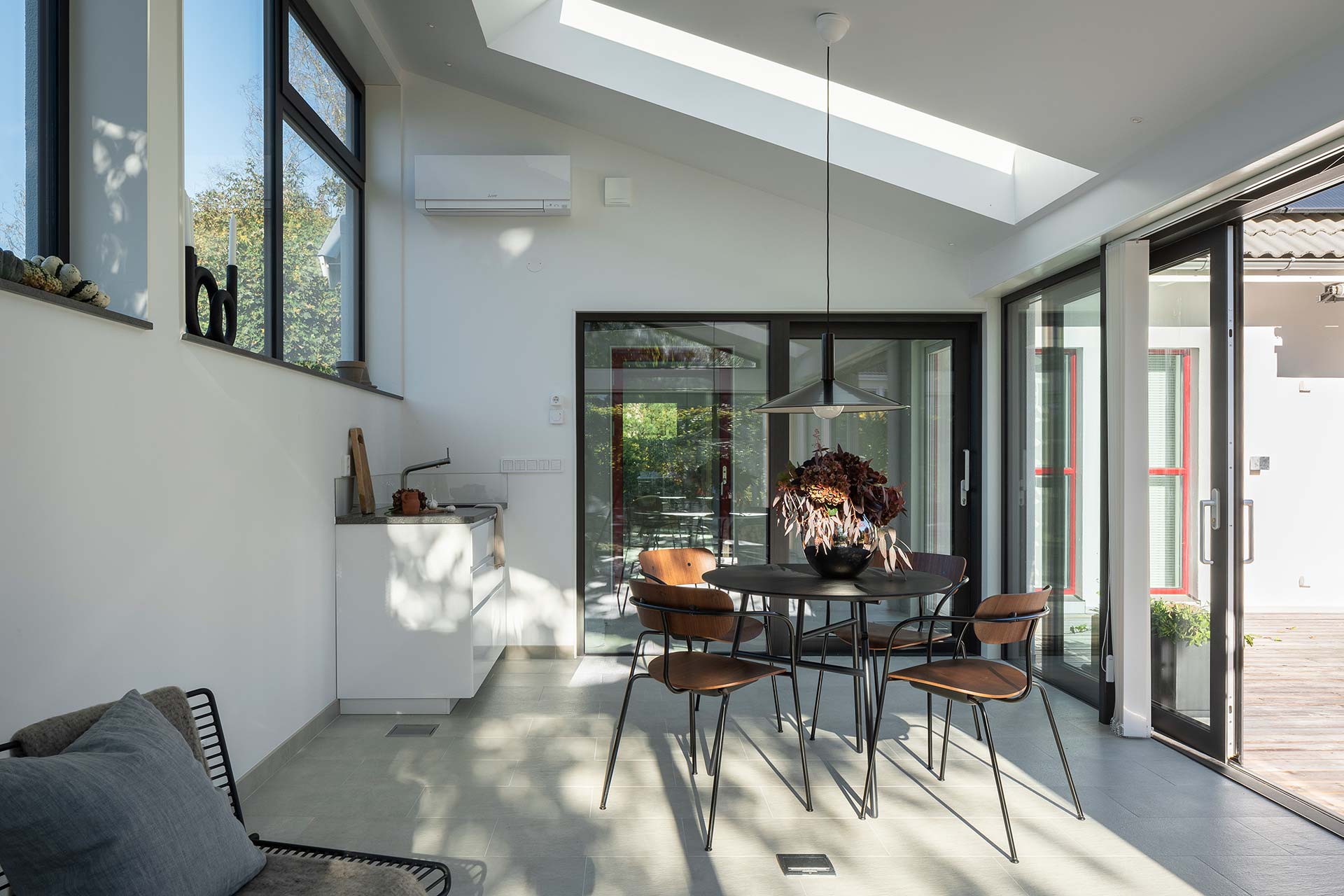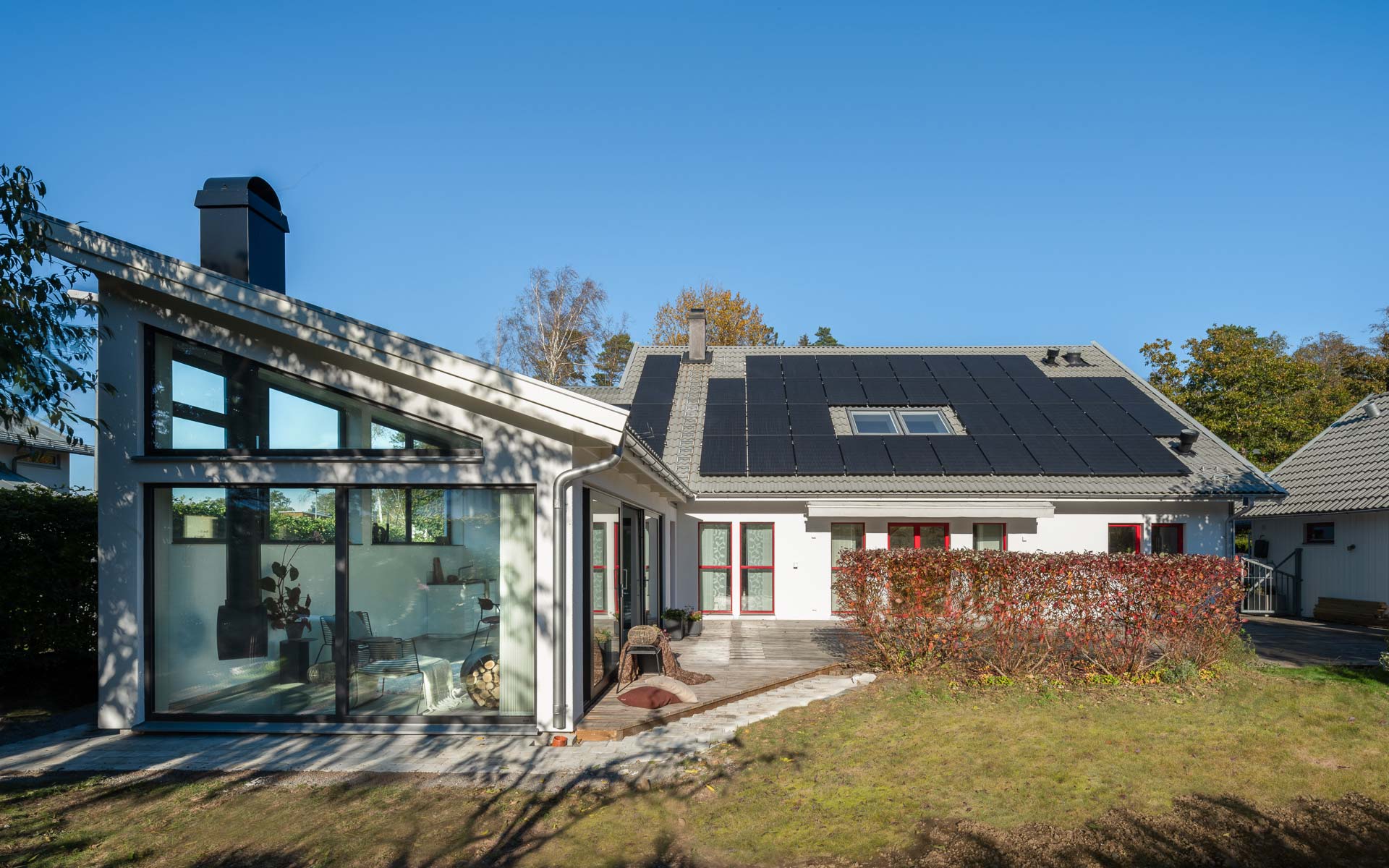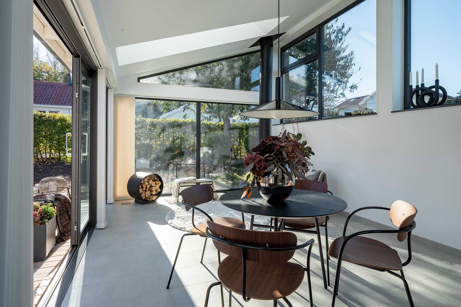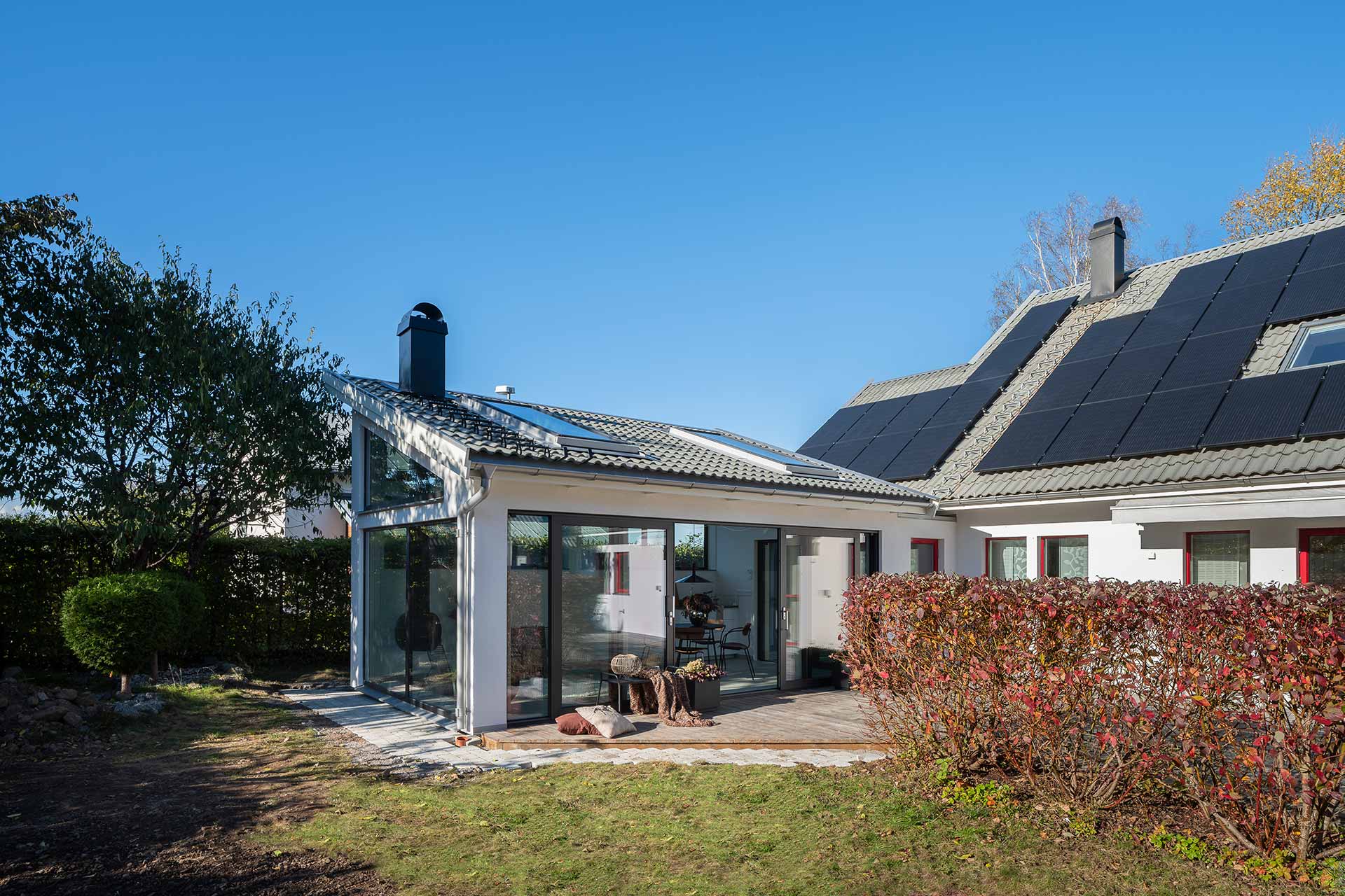En utbyggnad i vinkel från huvudbyggnad ramar in trädgården och blir en plats för lugn och kontemplation. Som ett separat litet hus du når direkt från vardagsrummet. Sammanbyggt, men ändå avskärmat. Helt uppglasat mot trädgården och med en liten eldstad kan detta rum njutas hela dygnet, året runt. Huvudbyggnad är även utbyggd mot väster, för att tillskapa ett arbetsrum och en balkong där man kan blicka ut över området. Genom att låta befintlig byggnad råda, får man en byggnad som växer naturligt och genom att förstärka de värden som finns kan man dessutom tillföra nya.