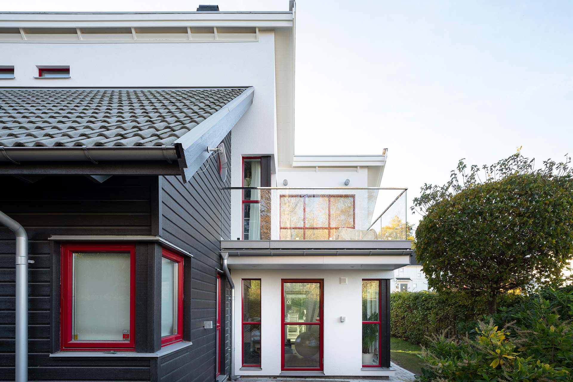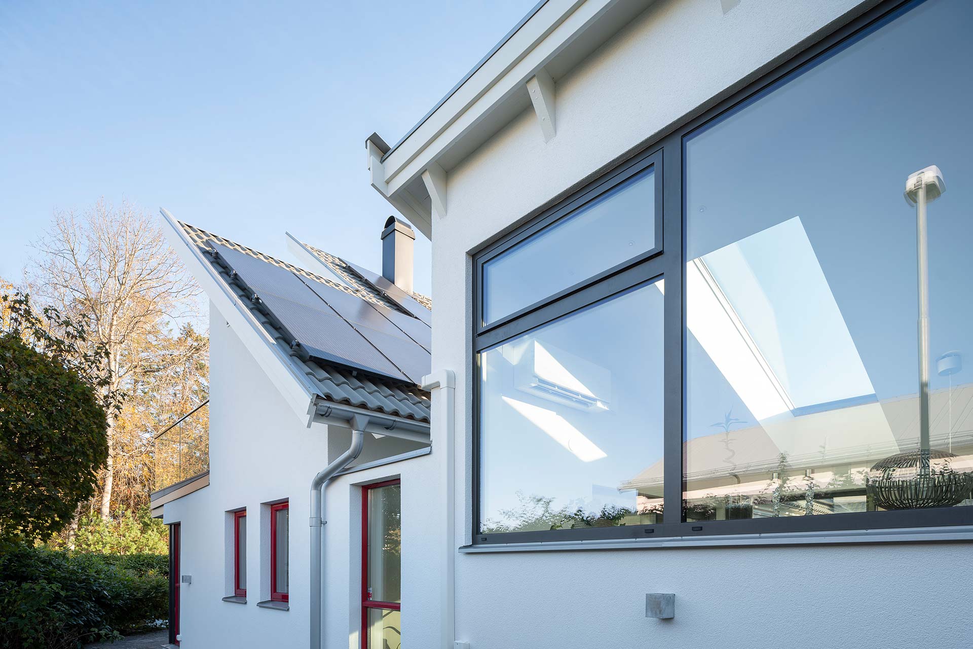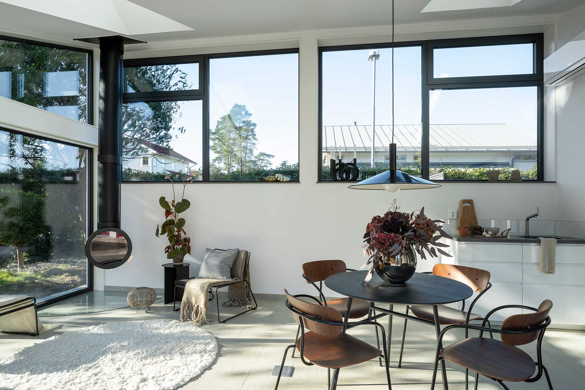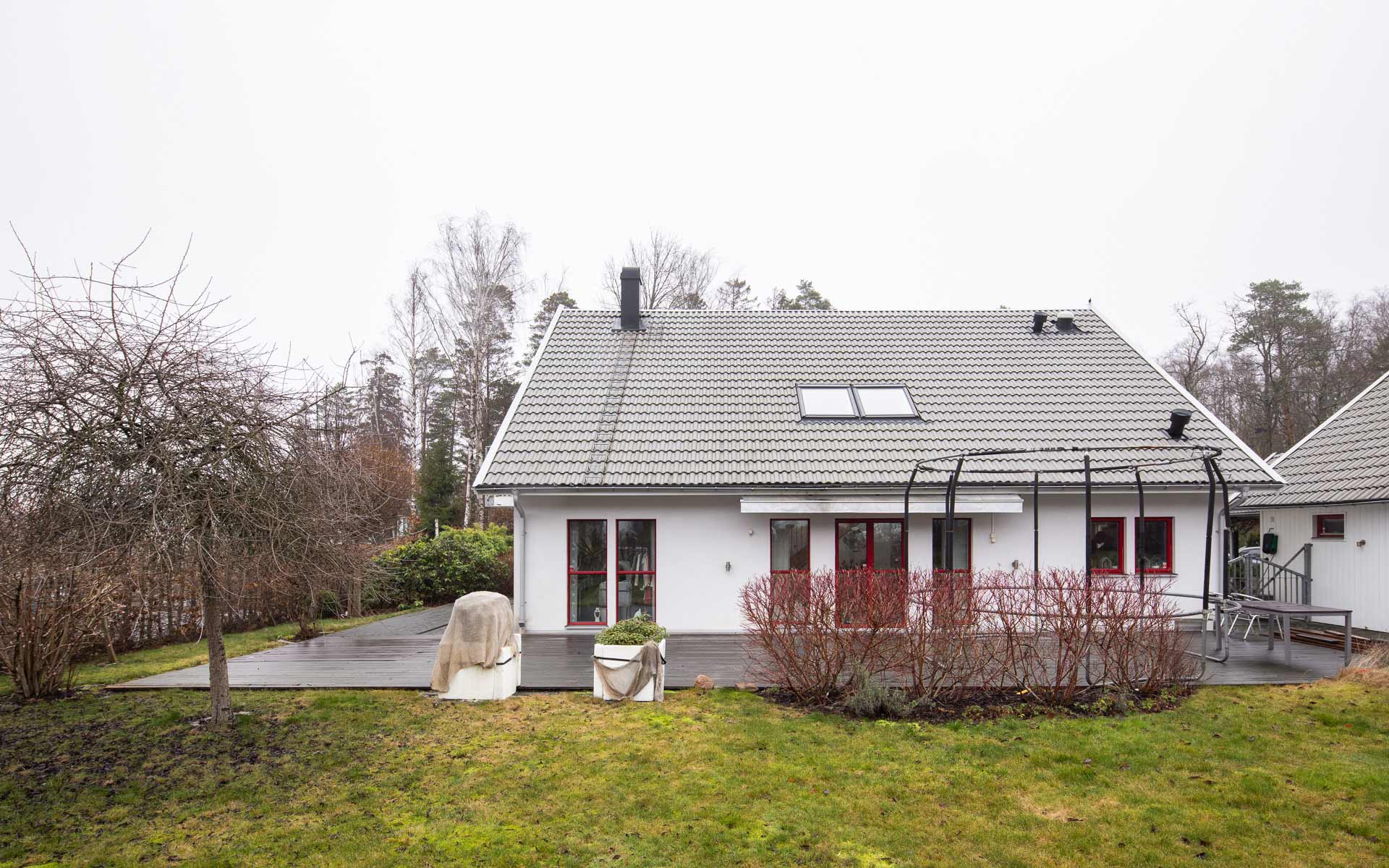 En utbyggnad i vinkel från huvudbyggnad ramar in trädgården och blir en plats för lugn och kontemplation. Som ett separat litet hus du når direkt från vardagsrummet. Sammanbyggt, men ändå avskärmat. Helt uppglasat mot trädgården och med en liten eldstad kan detta rum njutas hela dygnet, året runt. Huvudbyggnad är även utbyggd mot väster, för att tillskapa ett arbetsrum och en balkong där man kan blicka ut över området. Genom att låta befintlig byggnad råda, får man en byggnad som växer naturligt och genom att förstärka de värden som finns kan man dessutom tillföra nya.
