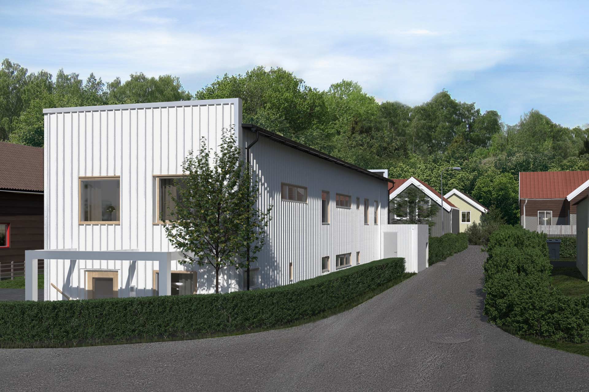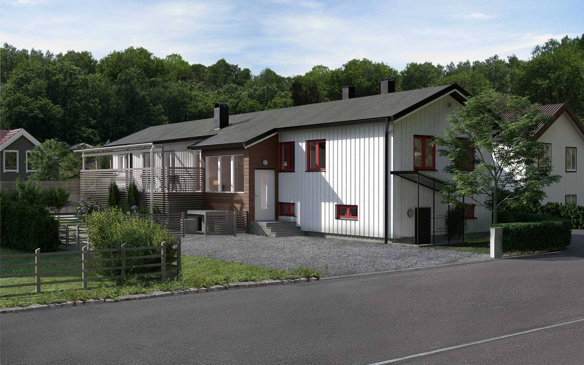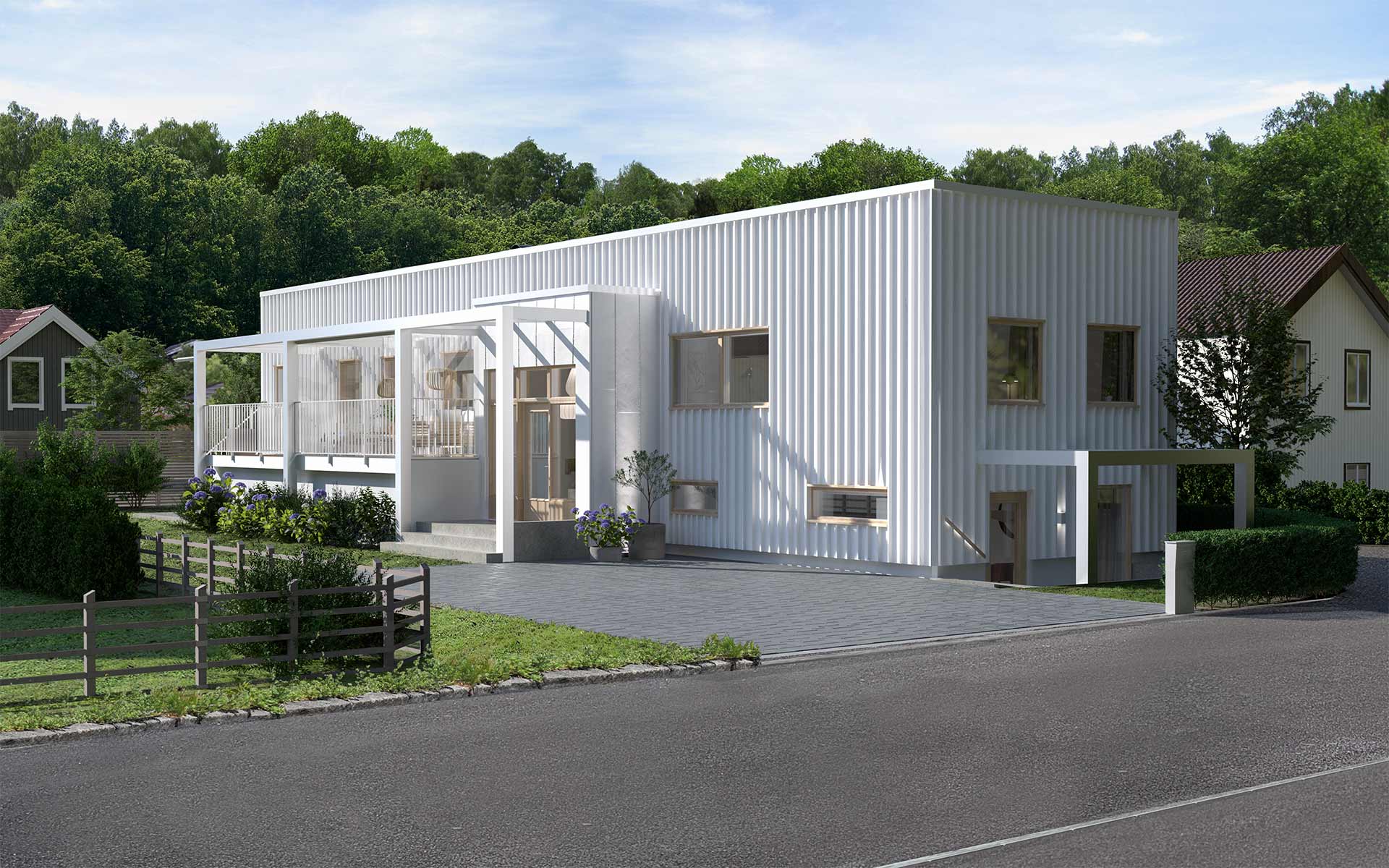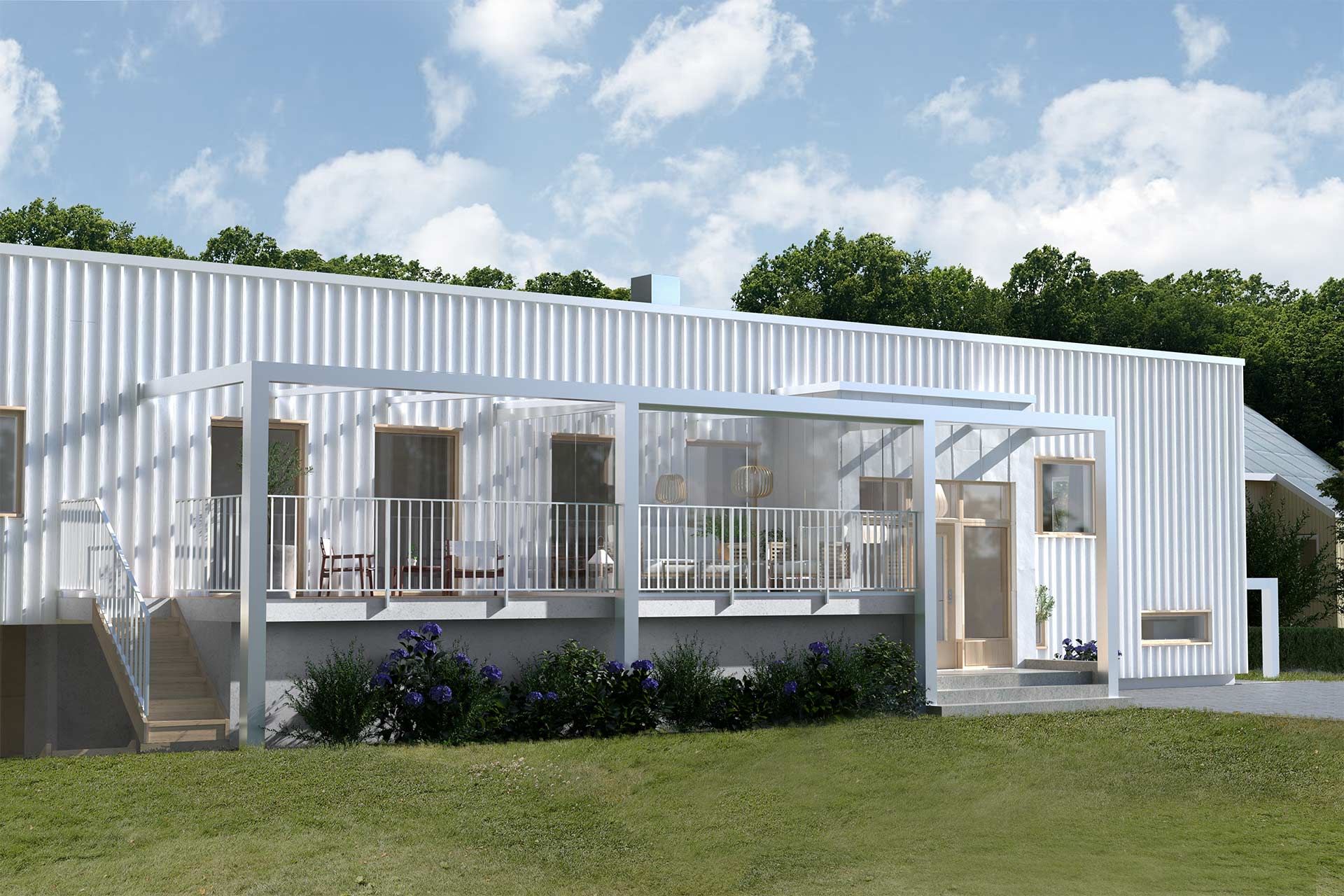 En egnahemsvilla i ett plan ovan halv källarvåning och med traditionellt sadeltak byggs om för att få till en mer ändamålsenlig planlösning och ett nytt exteriört uttryck. Med en mer effektiv planlösning och fokus på att tydligare dela upp sociala ytor, hemmakontor och familjens alla sovrum frigörs en gästlägenhet i nedre plan. Utbyggnaden skapar en ljusare och rymligare hall och husets entré markeras tydligare. Genom att höja fasad på tre av byggnadens sidor och låta takfall luta ned mot gata, bibehålls ursprunglig byggnads skala mot gata och samtidigt skapar höjningen höga fina rum in mot den egna trädgården. En enfärgad fasad sätter fokus på struktur med panelens skuggspel och den falsade plåtens släthet och den öppna pergolan som silar ljuset in till rummen innanför. Ursprunglig byggnads egnahemsfunkis lyfts till en stramare form som utmanar med ett mer geometriskt språk. Uteplatsen blir en möjlig förlängning av kök, matplats och vardagsrum och möjliggör ett flitigare utomhusliv i bostaden.