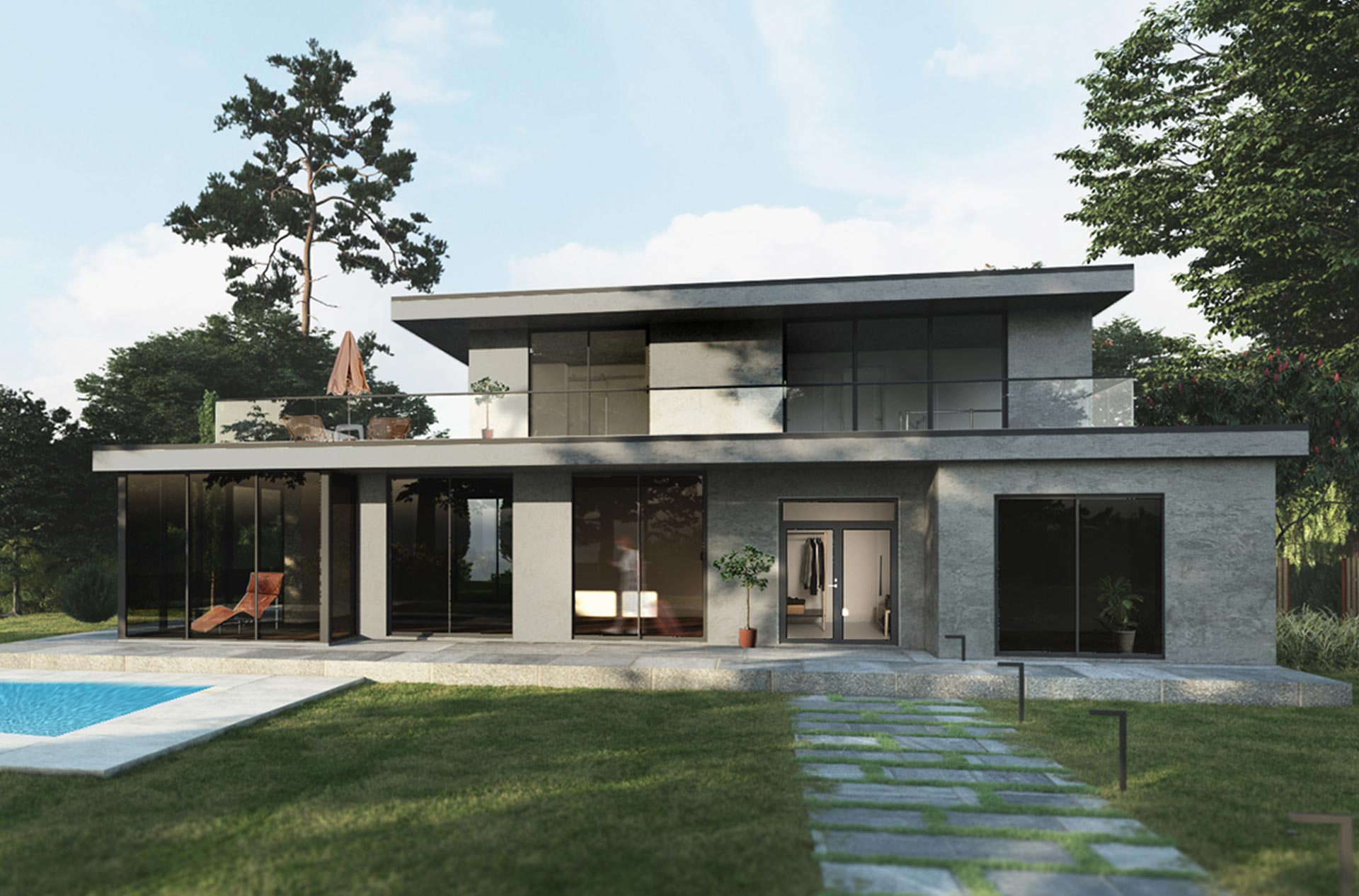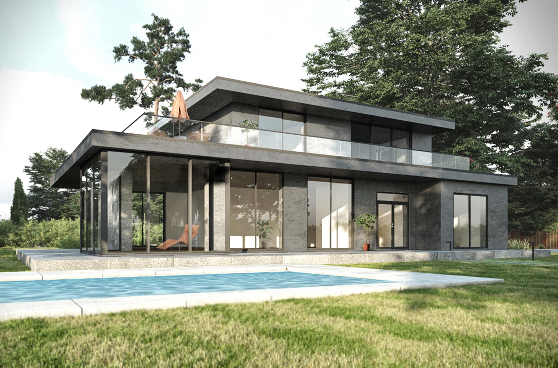 Beställarens önskemål var att på en skogstomt bygga ett modernt stenhus med stora sociala ytor i nedre plan och väl tilltaget altanutrymme i övre plan. Därtill ett garage med carport och komplementsbostad i Attefallshus i samma stil. En rektangulär, steninfattad pool på huvudbyggnads framsida reflekterar ljuset och utökar zonen kring bostaden. I den strängare stil beställaren efterfrågat, har det varit viktigt att i förhållande till platsen och tomtens planering ta upp arkitekturen och samtidigt möta omgivande natur, så att det byggda smälter väl in på platsen.