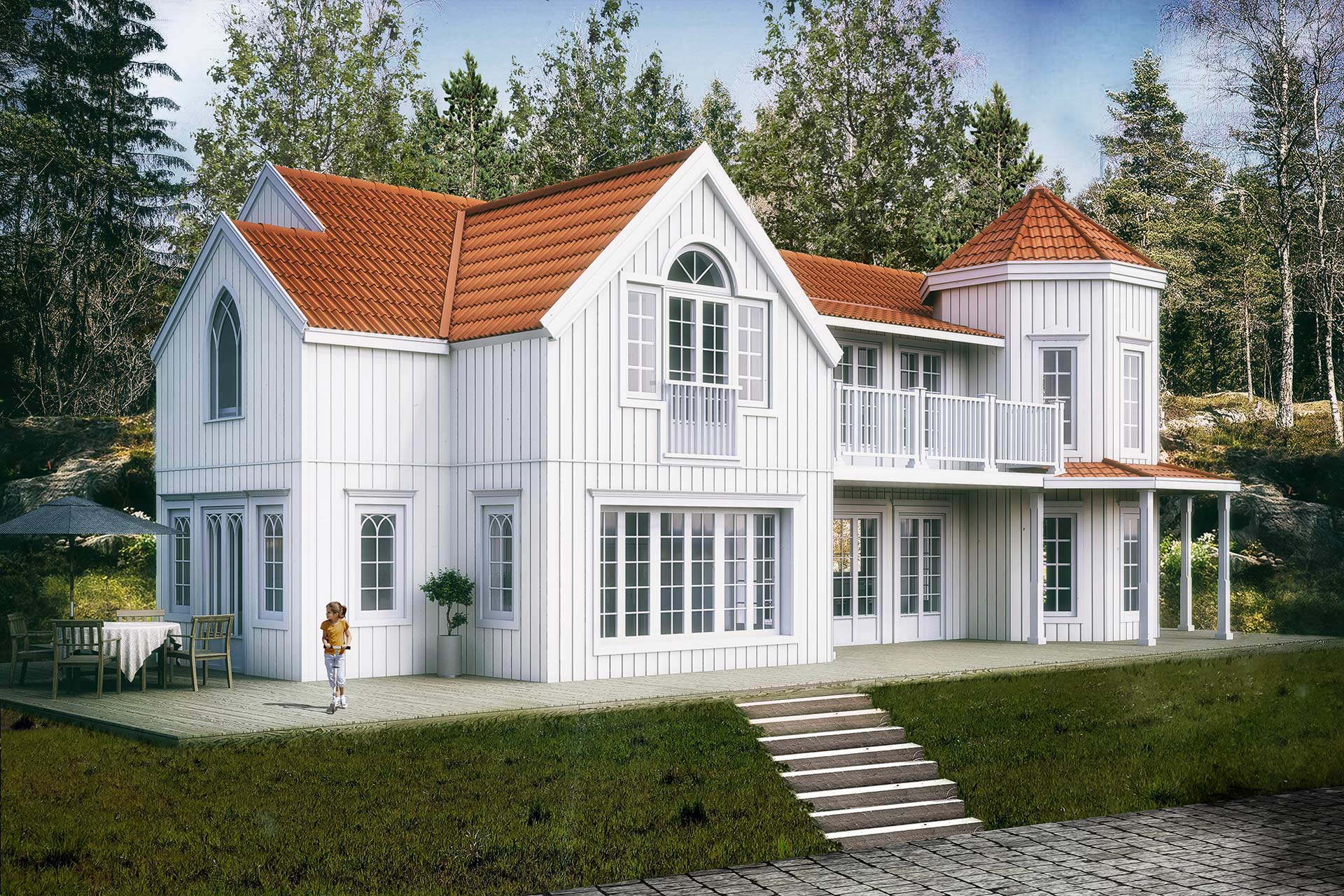 Ett litet träslott med torn, en klassisk träbyggnad på en klippa mot havet, skapar ett nytt landmärke för sjöfarten. Ett par som lämnat staden bakom sig, ville förverkliga husdrömmen och inte utelämna några detaljer. Den begränsade tomten har tvingat fram en del kompromisser, vilka hanterats som möjligheter och bidragit till att skapa en unik byggnad efter högst personliga önskemål. Ägarnas intresse för blommor och odling tas tillvara i ett växthus mellan det branta berget och entrén. Med byggnadens läge längst in på gatan, längst ut på berget, får de ostört ägna sig åt sina intressen.